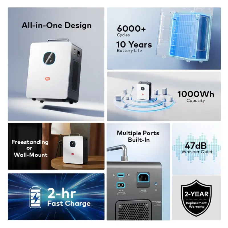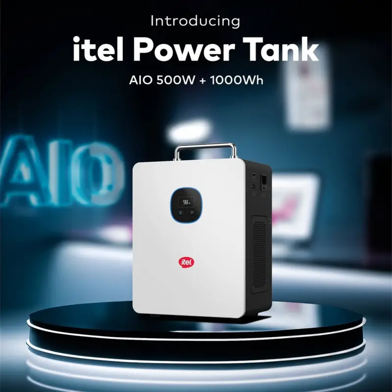 The Itel Power Tank (IESS 05K10N) is a 500W/1000Wh (1kWh) all-in-one portable solar inverter with a LiFePO4 battery, designed for home/office backup. It features fast dual-charging (grid/solar) in 2 hours, a 3-in-1 design (inverter, battery, solar controller), and supports devices like fans, TVs, and laptops.